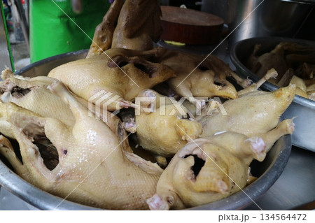 鐵桶裡裝的許多剛川燙煮好的鴨肉