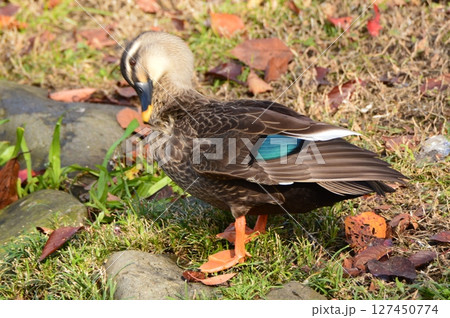 一隻在地面上行走的斑嘴鴨(東京都立川市)