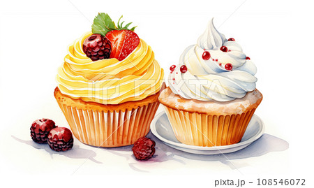 Hand drawn watercolor collection of cream cupcakes decorated with berries and jam.