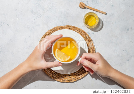 Hand holding cup of hot tea with lemon and honey on a white textured background with shadows.