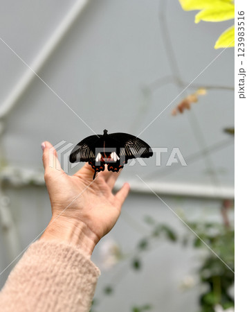 Butterfly in the hand on the background of a green house. Papilio helenus is a large swallowtail butterfly found in forests of southern India and parts of southeast Asia.