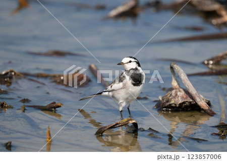 秋天,一隻白鶺鴒在蓮田裡覓食