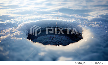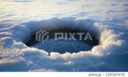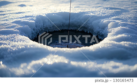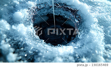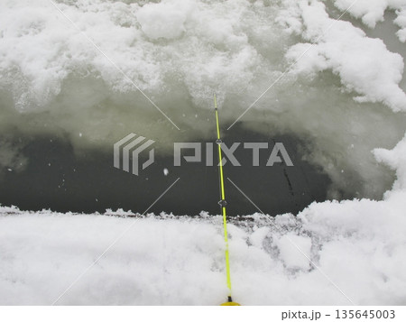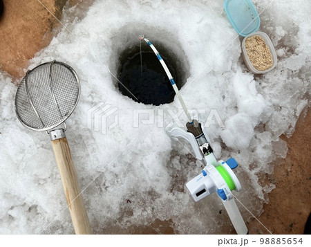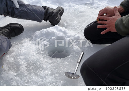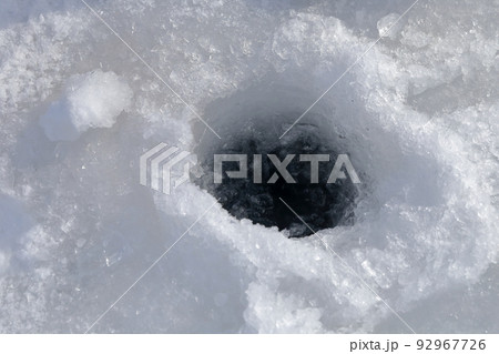 用鑽頭在冰上鑿出的洞(長野縣小海町松原湖的冶魚)