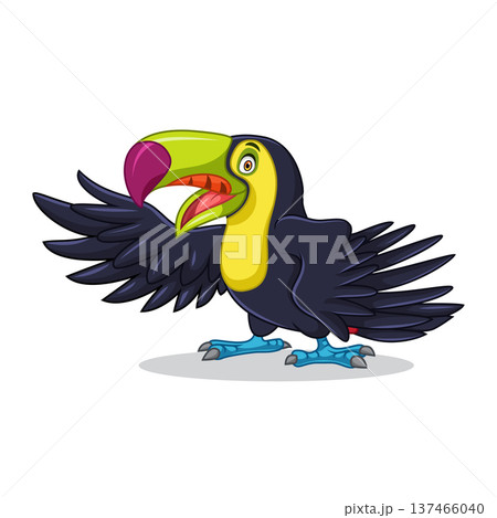 A cute of bird toucan is flapping its wings while smiling.