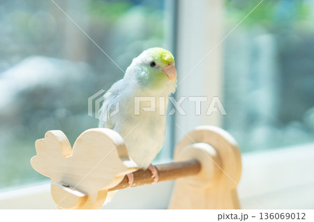 A Captive Forpus Parrotlet Perching on a Wooden Stand by a Sunlit Window with Soft Pastel Background