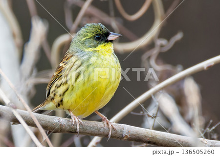一隻雄性日本鹀棲息在枯樹上