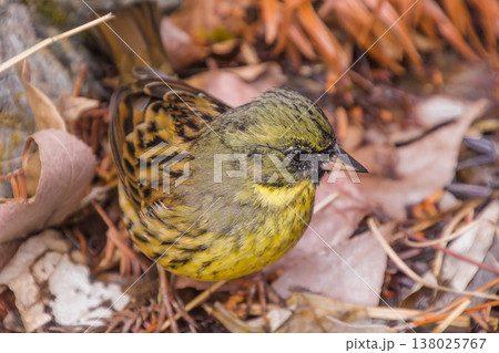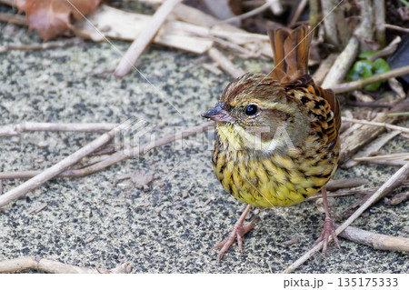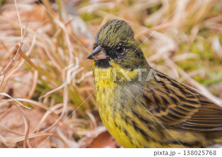 一隻雄性黃鷂(Emberiza spp.)在地面覓食。