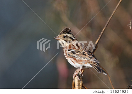 一隻日本鹀在荒川河岸的灌木叢中覓食。