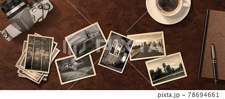 老照片排列在一張古色古香的桌子上。從正上方角度