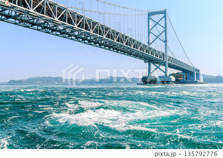 晴朗天氣下的鳴門橋和春潮時的鳴門漩渦