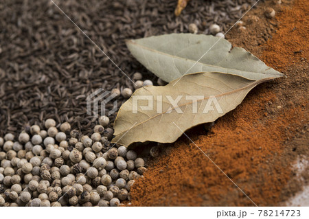 Colorful mix of herb and spice varieties: curry and coriander, turmeric and cumin, paprika and pepper, mustard and salt, cardamon and oregano and saffron. Selective focus, shallow DOF
