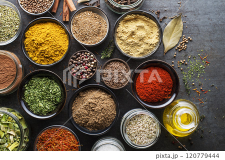 Colorful mix of herb and spice varieties: curry and coriander, turmeric and clove, paprika and pepper, cinnamon and garlic, cardamon and oregano