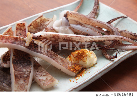 黑色背景過夜乾魷魚配蛋黃醬和調味料