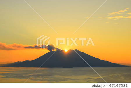 鹿兒島、櫻島、日出和波光粼粼的大海