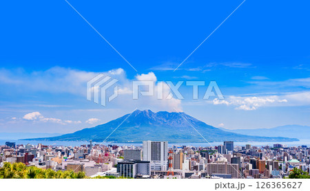 鳥瞰圖:櫻島全景、鹿兒島市和藍天【鹿兒島縣鹿兒島市風景】