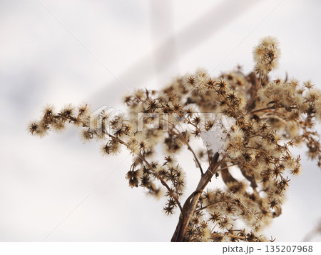 積雪覆蓋在枯萎的金雞菊上