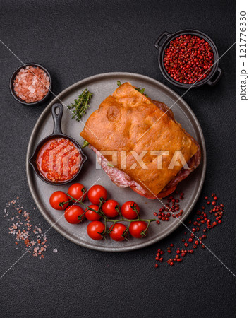 Focaccia with salami, cheese, tomatoes, arugula, salt, spices and herbs
