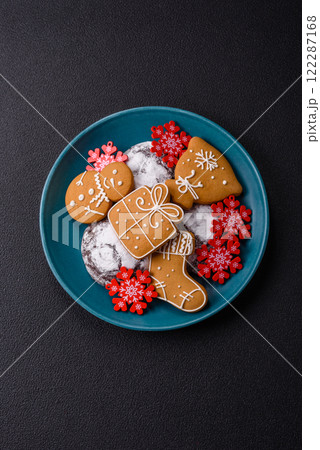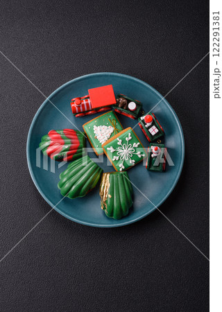 Sweet Madeleines desserts covered with chocolate in Christmas colors