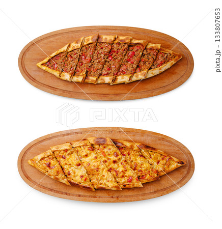 Traditional Turkish pide with various fillings for sale