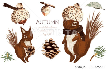 松鼠、橡實和松果插圖素材集