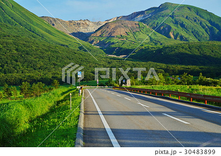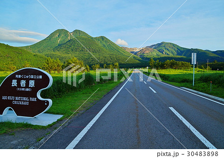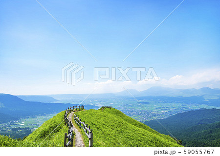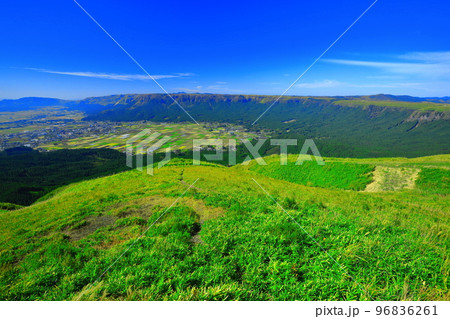 夏天的阿蘇飛升山,充滿生機的綠地和藍天
