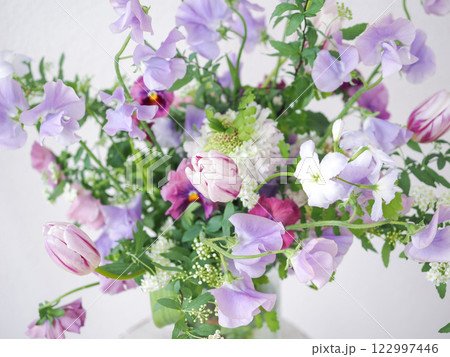 春天來了!三色堇花束。紫色,綠色,白色組合。甜豌豆也。很多褶邊。