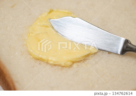 圖片展示了在麵包上塗抹人造奶油的過程