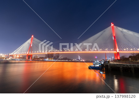 上海楊浦大橋的夜景,紅色的燈光和橘色的倒影映照在黃浦江水面上(長曝光)。