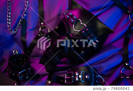 mask of a bdsm demon and leather accessories for bdsm games on a dark background in neon light