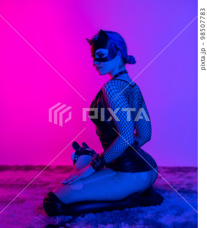 sexy girl in costume and mask bdsm games in neon light with empty background