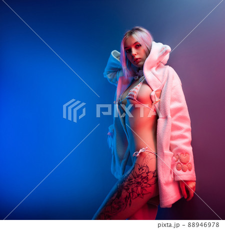 sexy young girl in a cute hoodie with ears in underwear in neon light