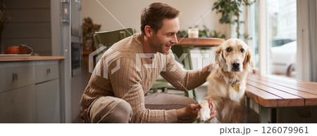 Portrait of young handsome man with his dog, sitting in cafe, golden retriever gives paw and looks at his owner
