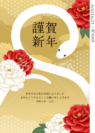 帶有蛇和富士山插圖的垂直 2025 年新年賀卡