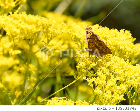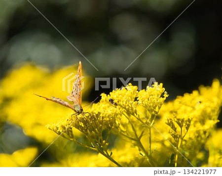 秋天,一枝黃花的花朵上可以看到一隻略顯疲憊的「北手葉蝴蝶」。