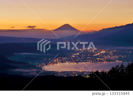 從高峠高原眺望黎明時的富士山和諏訪湖