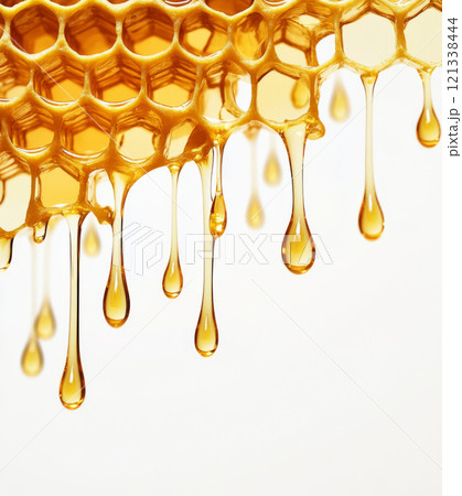 Golden honeycomb dripping with fresh honey against white background, showcasing natural beauty and texture of honeycomb structure