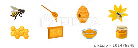 Honey with Dripping Sticky Nectar in Bowl and Honeycomb Vector Set