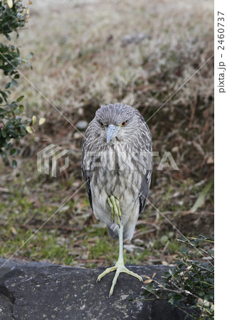 年輕灰鷺(Hoshigoi)隱藏在池塘岸邊的灌木叢中