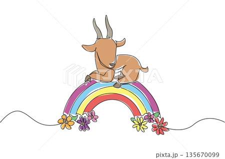 Continuous line drawing of elegant antelope with distinctive long horns is perched on a rainbow arc, beautifully decorated with blooming flowers at its base. Nature concept for cute wild animal,