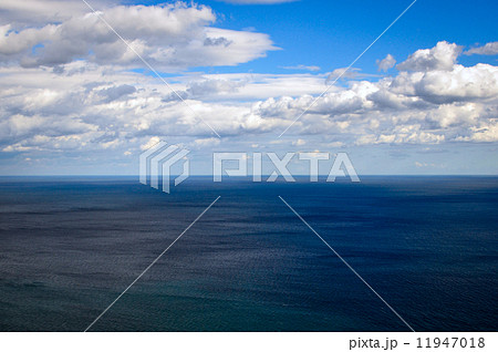 Panoramic seascape, calm azure sea, clouds and bright sky. View of the Black Sea coast in Crimea, Cape Fiolent in Sevastopol. Copy space. The concept of calmness, silence and unity with nature