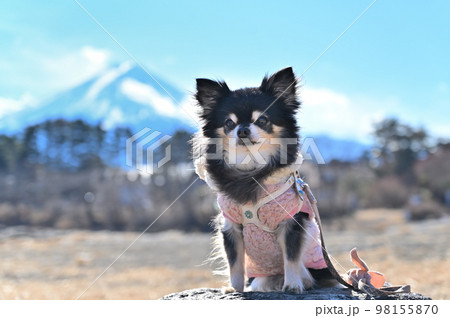 河口湖:沿著湖岸漫步的吉娃娃和富士山