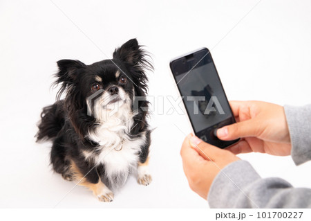 吉娃娃在用手機拍攝時眼神交流時等待好女孩