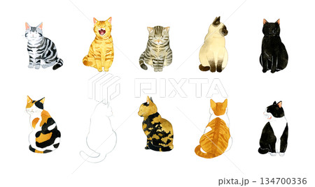 一組可愛的坐姿貓咪-手繪水彩寵物與動物插畫