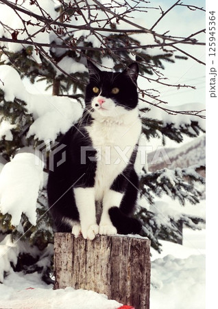 冬天,一隻黑白相間的大虎斑貓 Gin-chan 坐在紅色的信箱上