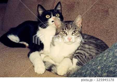 兩隻貓咪,Momo-chan 和 Gin-chan,在沙發上休息