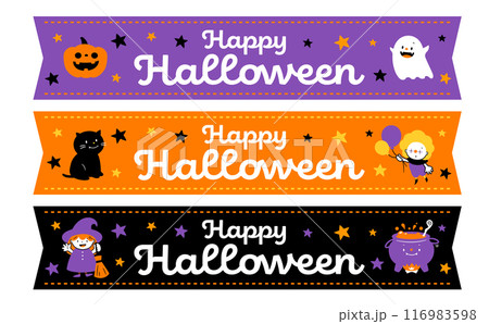 流行萬聖節絲帶框架背景非常適合活動橫幅和標題_南瓜、黑貓和鬼魂