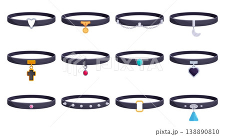 Neck chokers. Black leather or velvet neck stripes, decorative accessories for girls with silver gold jewelry pendants. Stylish accessory sapid vector clipart
