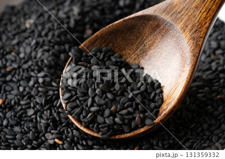 湯匙上的黑芝麻(生芝麻)的特寫