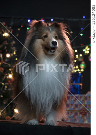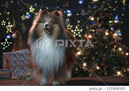 A festive holiday setting features a charming Shetland Sheepdog (Sheltie). The atmosphere is warm and full of seasonal cheer, which is characteristic of the Christmas period.