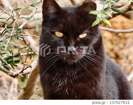 Gazing feline portrait, Reflective black cat with amber gaze and soft natural illumination details